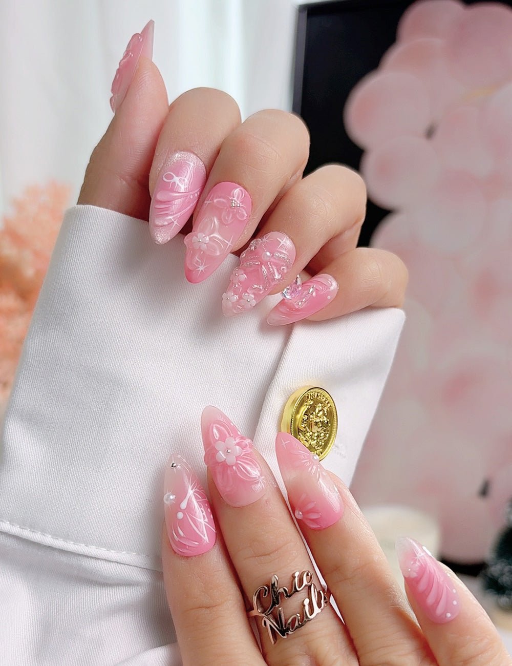 Sweet Blossom 3D Pink Press-On Nails – Almond Set