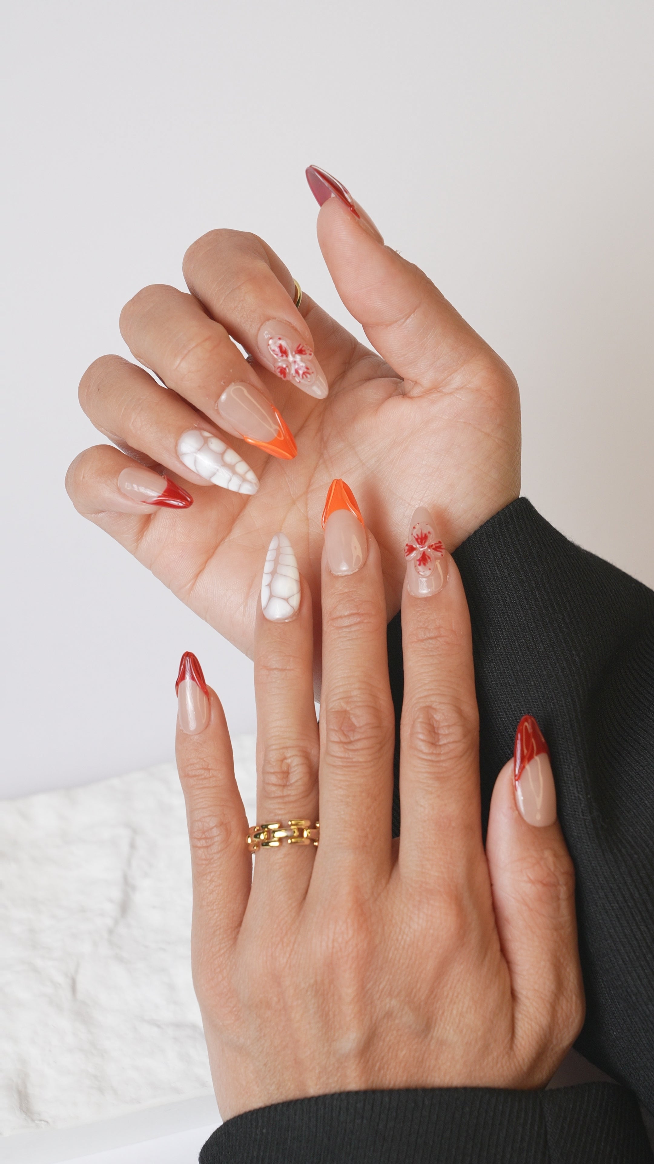Bring a burst of tropical energy to your nails with our Tropical Bloom medium press-on nails. This Medium Almond set, sized approximately 19-24MM, features a nude base adorned with vibrant red and orange tips, intricate 3D floral accents, and subtle texture details. Perfect for summer outings, vacations, or adding a bold statement to your everyday style, these nails exude warmth and creativity.