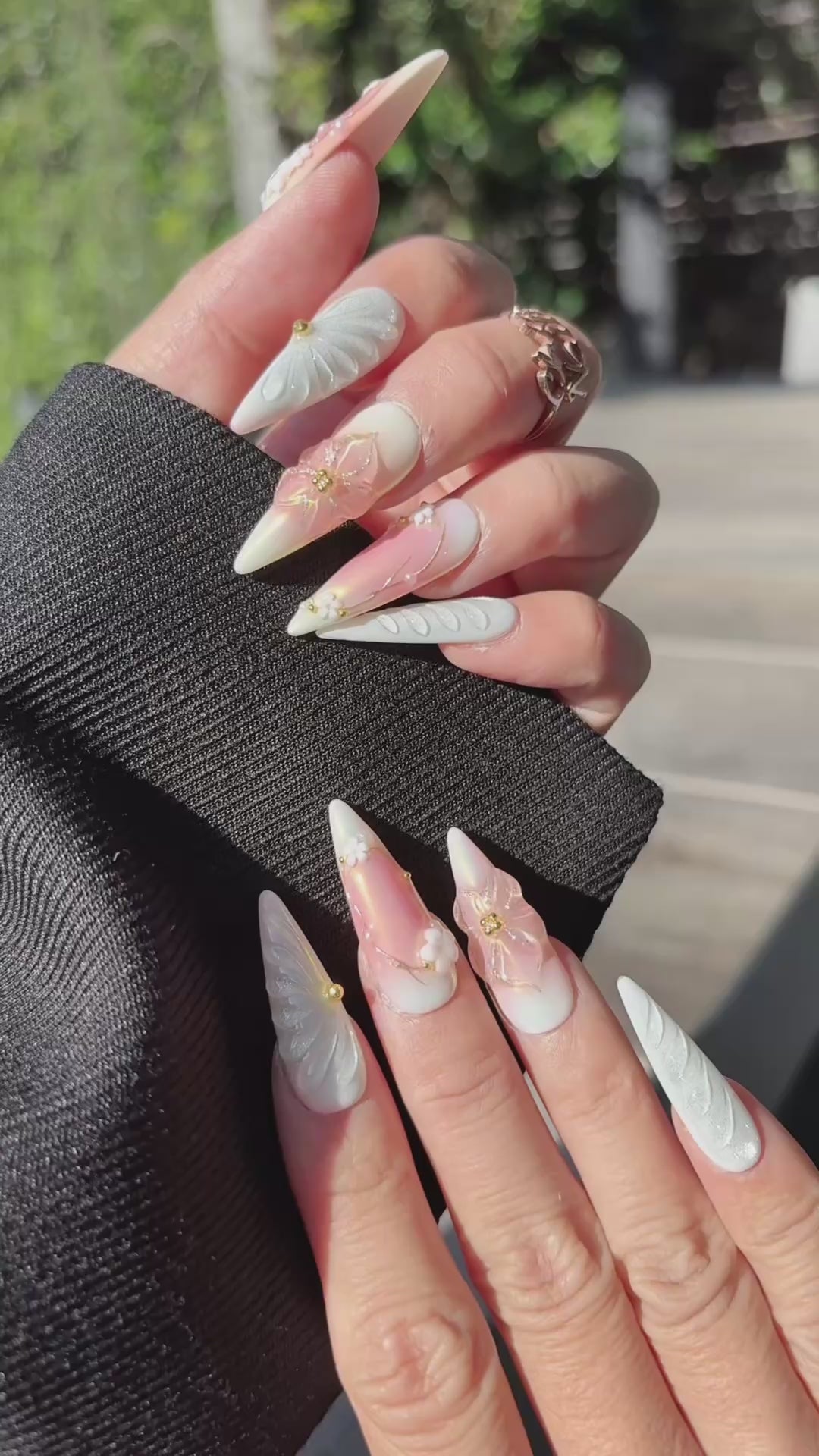 FINISH: Matte pearl white with sheer pink base, 3D butterfly and flower embellishments, and gold detailing