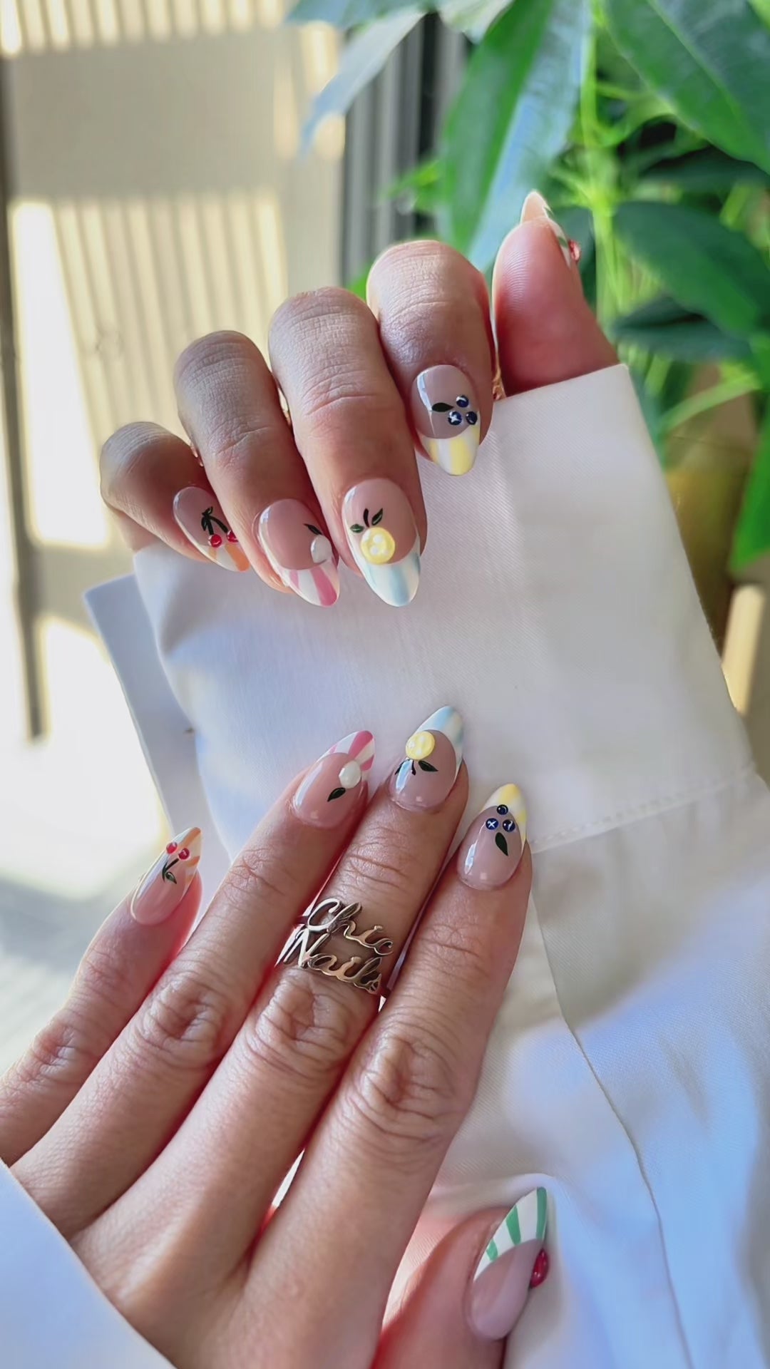 Brighten your day with our Candy Fruit Stripe Press-On Nails – a playful mix of pastel pinks, baby blues, lemon yellow, and soft nudes, topped with adorable 3D cherries, blueberries, and lemons, along with striped candy-style tips for a sweet, summery finish.