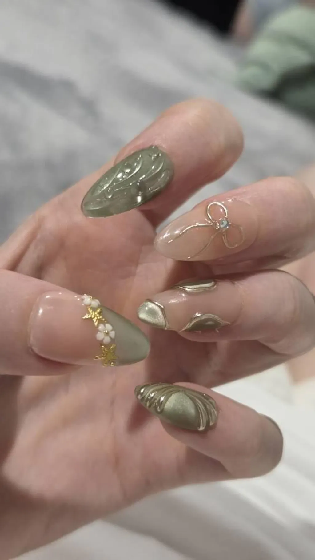 This handmade press-on nail set features a soft nude base paired with sage green tones and delicate 3D details. The design combines sculpted textures floral accents and subtle metallic elements to create an elegant and refined look.