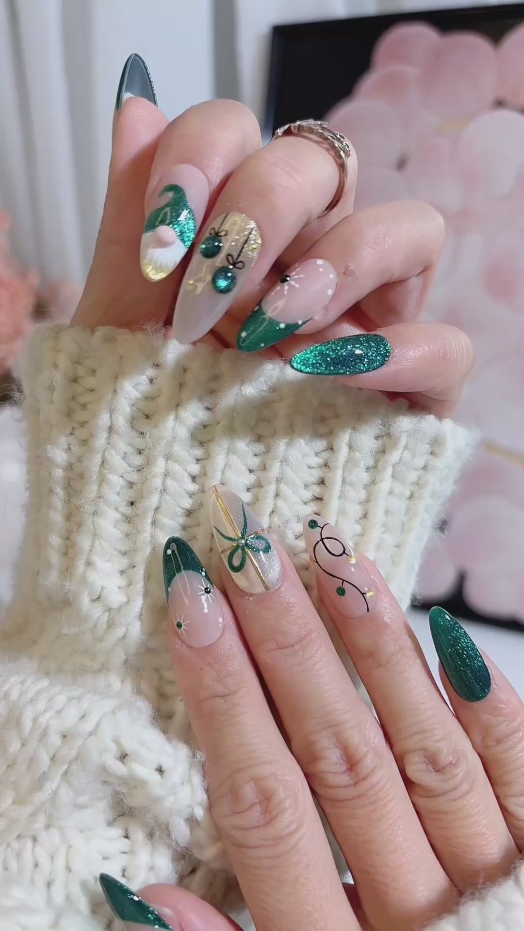 A festive mix of green French tips, tiny wreath loops, and starry Christmas light details — cute, clean, and full of holiday spirit.