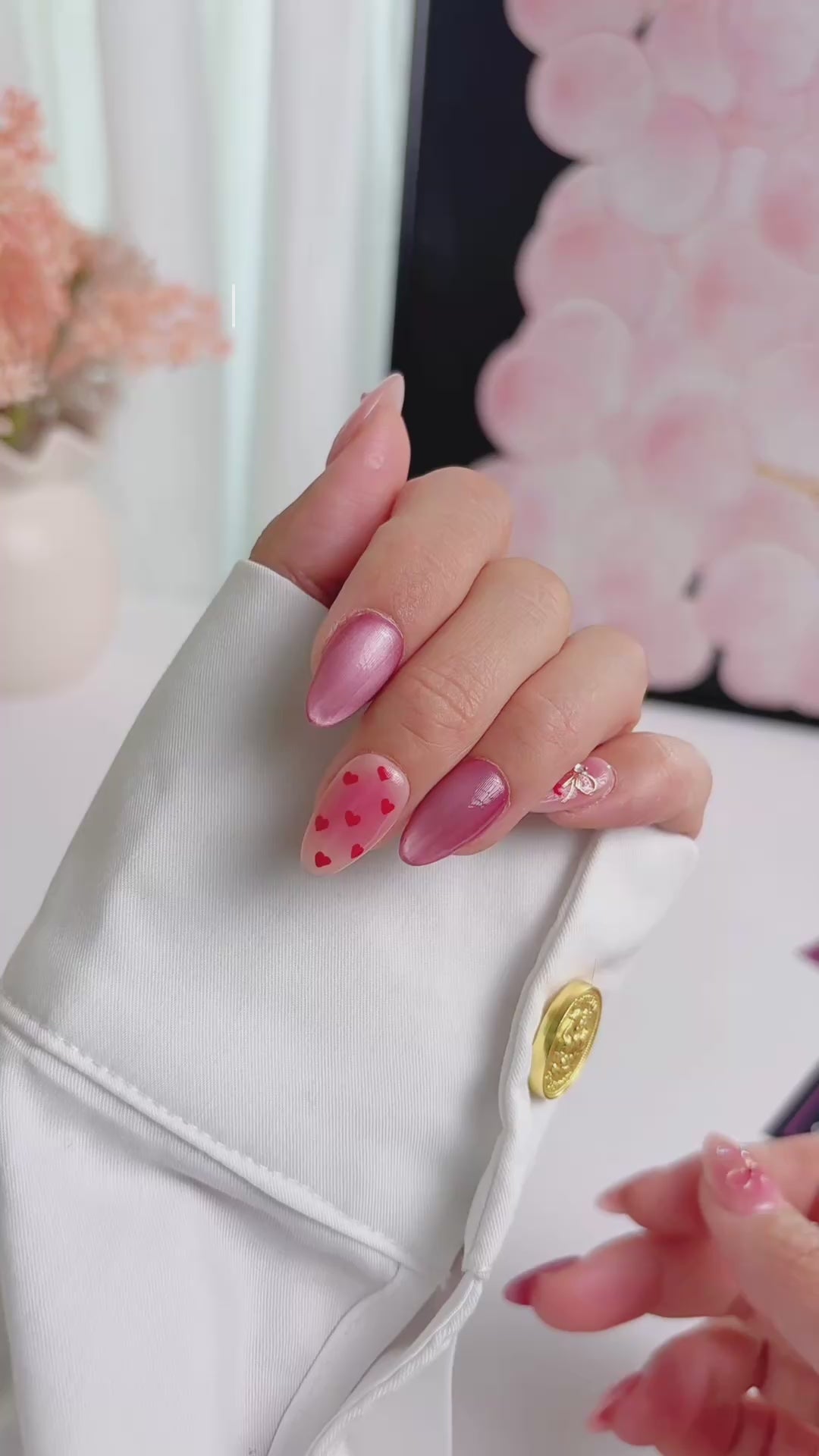 Luxury 3D Flower Press On Nails – Medium Almond Pink Gold Butterfly Design