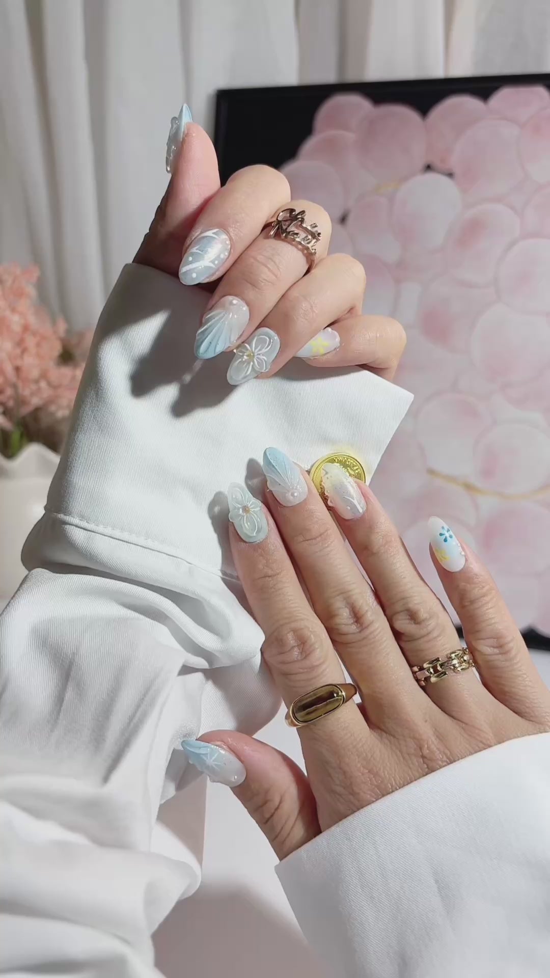 A sweet pink sakura-inspired set featuring glossy petal tips, 3D pearls, soft pink bases and white floral accents. The layered pink designs, translucent petals and raised details create a cute and fresh spring vibe perfect for everyday wear, photos or special occasions.