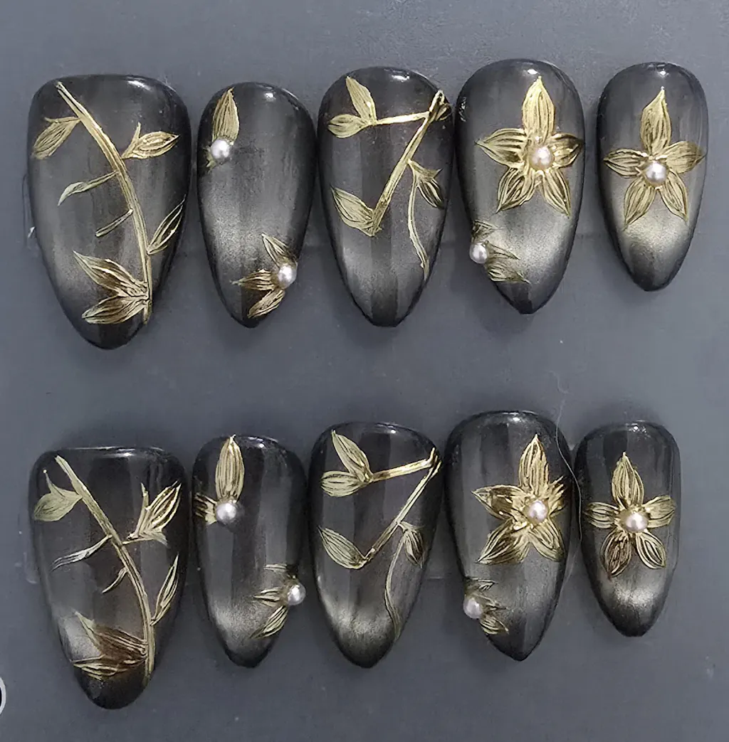 Elegant and ethereal — our Silver Cat Eye Press-On Nails feature a shimmering grey-blue cat eye base paired with delicate golden floral accents. This design brings together quiet luxury and celestial vibes, perfect for winter nights, formal events, or when you're feeling dreamy.