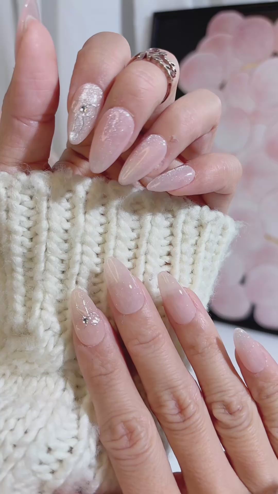 A soft pink sparkle design with subtle glitter and a tiny crystal accent — giving your hands a clean, dreamy, and elegant glow.